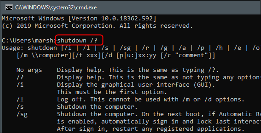 ဢၼ်ၼႆႉၼႆႉ ပဵၼ် ၵၢၼ်လိူၵ်ႈသၢင်ႈပႅၵ်ႇၵၼ်သွင်ဢၼ် တွၼ်ႈတႃႇ ဢိုတ်းၶွမ်းလႄႈ တႄႇပိုတ်ႇၶွမ်း တီႈ ၶွမ်း Windows ၸဝ်ႈၵဝ်ႇ။ တွၼ်ႈတႃႇ ဢဝ်တူၺ်း သဵၼ်ႈမၢႆတဵမ်ထူၼ်ႈ ႁင်း ၵၢၼ်လိူၵ်ႈသၢင်ႈ လွင်ႈဢိုတ်းၶွမ်းၼၼၼ်ႉ ပေႃႉ shutdown /? သႂ်ႇတီႈၼႂ်း Command Prompt သေ ၼဵၵ်းပၼ် Enter လႄႈ။ ပေႃးၼၼ် ဢၼ်ပဵၼ်သဵၼ်ႈမၢႆ ၼဵၼ်လၢႆႈ လႄႈ လွင်ႈမၼ်းၼၼ်ႉ တေဢွၵ်ႇမႃးၼႄပၼ်ယူႇ။