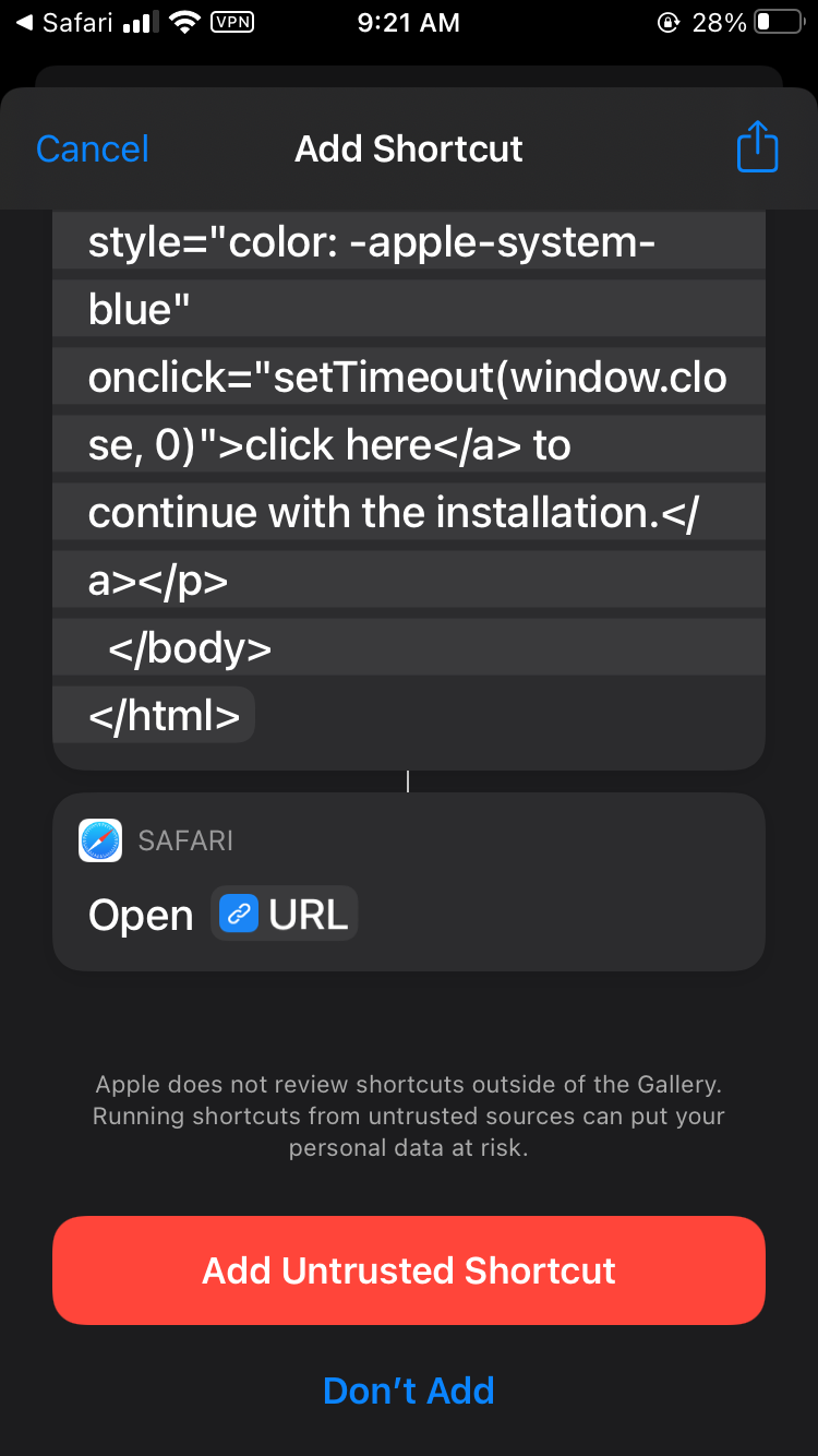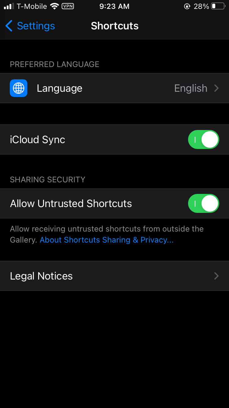 "ပေႃးၶိူင်ႈၸဝ်ႈၵဝ်ႇ ဢမ်ႇၸၢင်ႈတဵၵ်း "Add Untrusted Shortcut" / ဢမ်ႇၸၢင်ႈဢူၼ်းသႂ်ႇၼႆႉ ၵႂႃႇတီႈ Settings >> Shortcut >> ပိုတ်ႇပၼ် Allow Untrusted Shortcuts