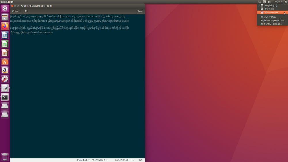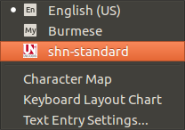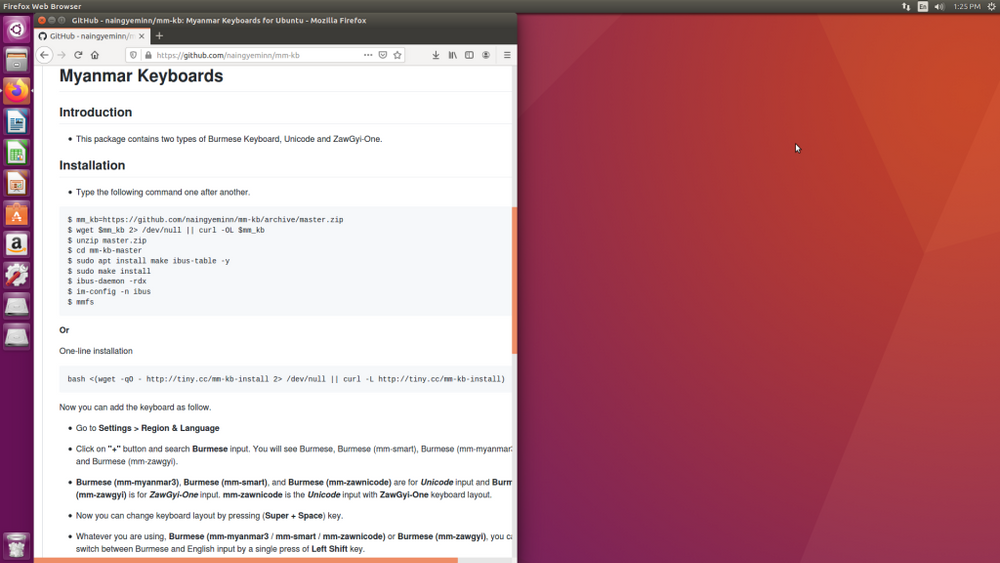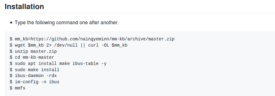 $ mm_kb=https://github.com/naingyeminn/mm-kb/archive/master.zip $ wget $mm_kb 2> /dev/null || curl -OL $mm_kb $ unzip master.zip $ cd mm-kb-master $ sudo apt install make ibus-table -y $ sudo make install $ ibus-daemon -rdx $ im-config -n ibus $ mmfs